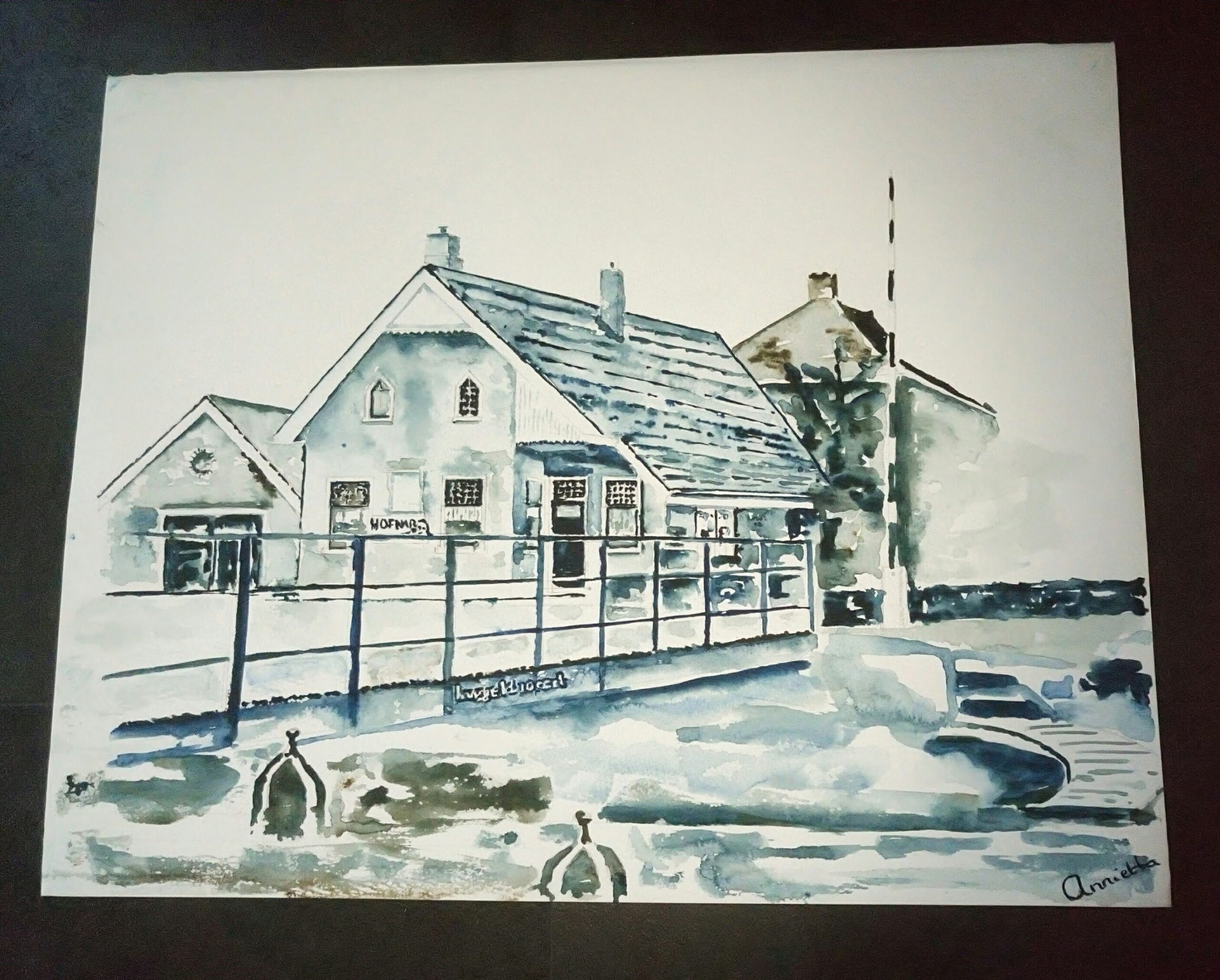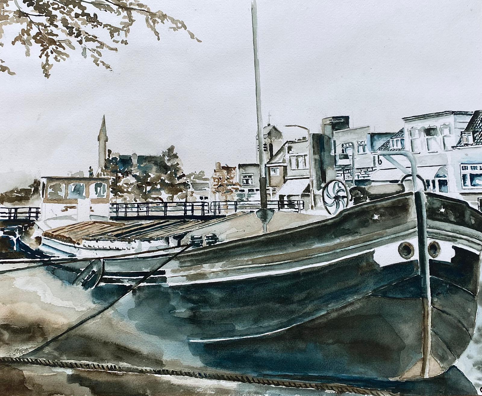 Zo heb ik ook een eigen stijl ontwikkeld met name bij het aquarelleren, donkerbruin en donkerblauw zijn de kleuren die deze stijl een oude sfeer geven, denk maar aan oude gebouwen of schepen. Zo ben ik begonnen met een aquarel te maken van het brugwachtershuisje waar ik ben geboren van mijn opa en oma, daarna heb ik een aquarel gemaakt van het schip van mijn ouders van een oude zwartwit foto.